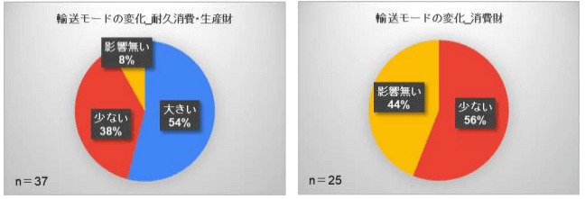輸送モードの変化については、業種別での違いが大きく表れた結果となっています。消費財では輸送モードの変化の影響が「大きい」と回答した企業がなかった一方で、耐久消費・生産財では半分以上の企業が輸送モードの変化の影響が「大きい」と回答しています。これは、海外販売比率が高い耐久消費・生産財の「輸出型企業」への影響が特に大きくなっていると推察されています。