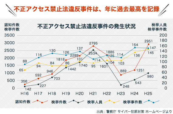 不正アクセス禁止法に抵触する事件は、2009年をピークに一時減少傾向にあったものの、2013年に急増し、過去最高を記録。事件として認知された件数だけで、年間3000件近くにのぼろうとしています。