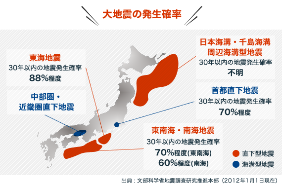 また、内閣府がWEBで発信している防災情報のページによると、30年以内に首都直下地震が発生する確率は70%。南海トラフの沿岸地域でも、東海地震88%をはじめ、高い確率で大規模な地震が起こると予測されています。