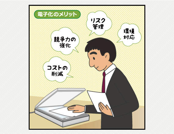 文書情報をスキャニングして保管することのメリットは、日々の業務における情報の検索性・共有性の向上や保管スペース縮小化、さらには、文書を複写して社外に持ち出すことや紛失を防ぐというセキュリティ面の強化などが実感しやすいものとして挙げられます。またこれらの他にも、文書管理にまつわるトータルコストの削減や競争力強化といったビジネスメリットに直結した効果が期待できます。