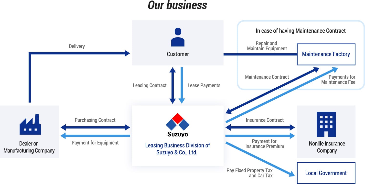 We lease vehicles and equipment suitable for customers' businesses. Payment to the vendor is done by us. Customer can use vehicles and equipment by paying leasing costs for a fixed period making their funding and cost management easier. By including costs for tax and insurance, etc. in the lease contract, costs for asset management can be reduced. Leased property can be used continually by renewing the lease contract.