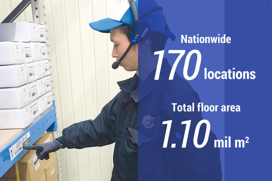 We have a logistic network throughout Japan including 170 warehouses covering a total floor space of 1,100,000 ㎡. Our distribution centers offer not only storage and delivery but also handles a variety of processing services, including export packing, labeling and kitting. We are realizing high operational and management service qualities for a variety of products from over tens of thousands of types of automobile parts to the kind of products which require strict hygiene control and accurate lot management, such as foodstuff and medical apparatus.
