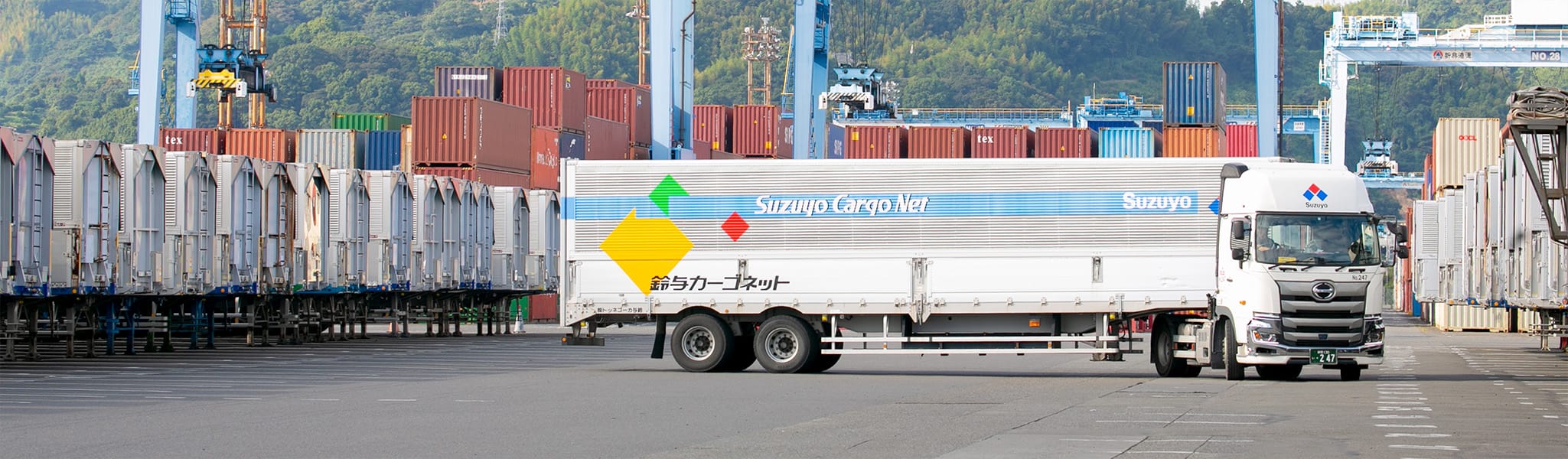 日本全国の航路に対応している海陸一貫輸送サービス。保有シャーシは約1,600本、年間輸送取扱実績は約70,000本と、業界トップクラスです。近年は、モーダルシフトによるCO2排出量の削減や、BCP対策としても注目されている輸送モードです。