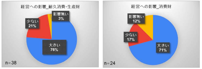 影響が大きいと回答した企業は7割以上であり、耐久消費・生産財と消費財(※)の双方の経営に大きな影響を与えていることが分かります。