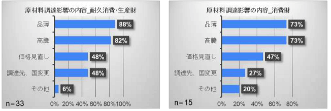 原材料等の調達に関しては、消費財に比べ耐久消費・生産財の方が影響が大きいことが分かります。また、具体的な影響内容については、「品薄」と「高騰」と回答した企業が、耐久消費・生産財では8割以上、消費財では7割以上という結果となっています。