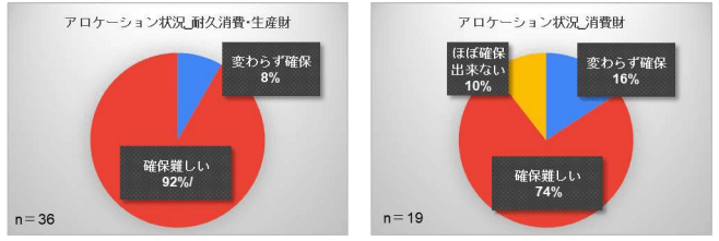 船のスペース確保に関しては、コンテナ不足の影響が大きく出ており、多くの企業が「確保が難しい」と回答しています。業種別に見ると、耐久消費・生産財の方が、消費財に比べて「確保が難しい」と回答した企業が多いという結果でした。