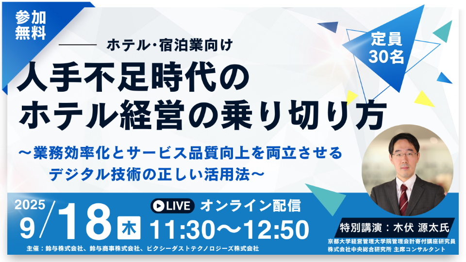 本ウェビナーでは、ホテル・宿泊業界の経営層および管理部門ご責任者の皆様を対象として、最新デジタル技術を活用した業務改革とサービス向上事例を紹介し、実務につながるヒントをご提供します。